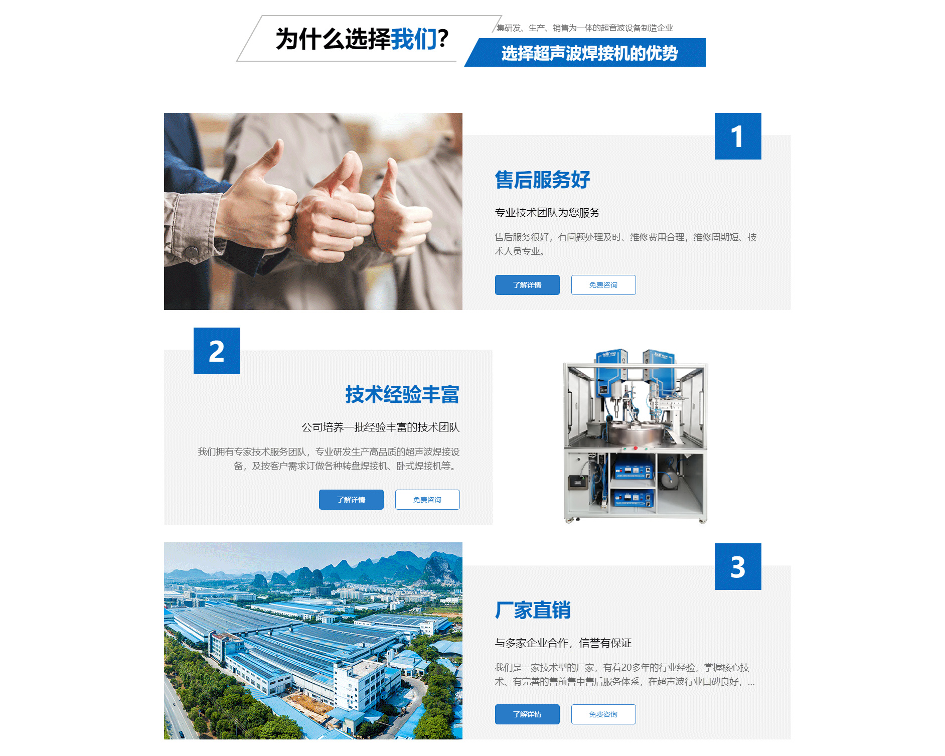 廈門勁榮機械設備有限公司是一家集研發、生產、銷售為一體的超音波設備制造企業,主要產品包括多規格型號的超音波塑膠熔接機、熱板式塑料焊接機、多工位轉盤焊接機、振動摩擦焊接機、旋轉式塑膠熔接機及配套的工裝夾具等。公司自2003年成立以來,一直致力于產品不斷完善中,并追求產品的精益求精,于2004年向國家商標局注冊了“勁榮”牌商標,2009年榮獲廈門市商標。 經過多年的努力,公司已經發展成為占地面積2000余平方米、擁有員工50余人的企業。公司一直將“品質是企業發展的原動力”作為經營理念,嚴把質量關,建立了一整套有效的安全生產及管理模式,不僅贏得了同行的認可,更取得了客戶的信賴,先后與九牧集團、路達工業、建霖集團、西伯電子、蒙發利實業、松霖科技、銥科集團、科司特電子等公司建立了長期的合作關系。 面對已經取得的成績,我們不驕不滿,因為深知業績只能代表過去,只有靠良好的產品質量和完善的售后服務才能在客戶中口碑相傳,在...